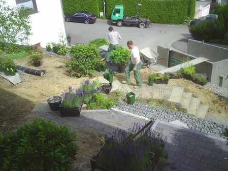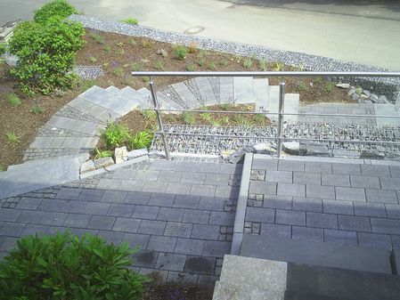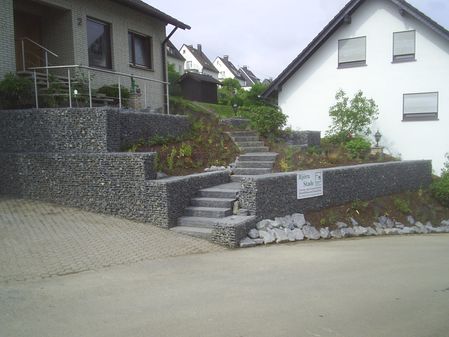 Umbau der Gartenanlage mit: - Gabionen - Beton- und Natursteinpflaster - abgesetzten Beetflächen - Bepflanzung