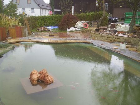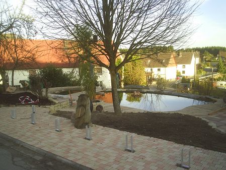 Umbau der Gartenanlage mit: - Schwimmteich in Beton und Folie - Betonsteinpflaster - Natursteinplatten und -mauer - Bepflanzung - Beleuchtung