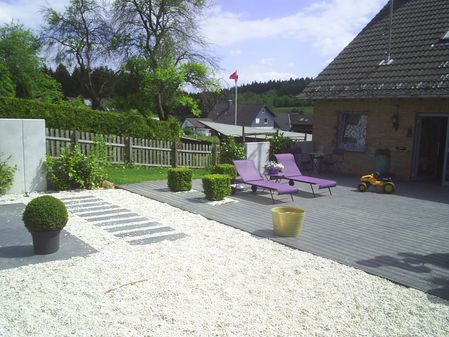 Umbau der Gartenanlage mit: - Erdarbeiten - Kunststoffterasse - Grossformat-Natusteinschieferplatten - Kiesflächen - Beleuchtung - Bepflanzung