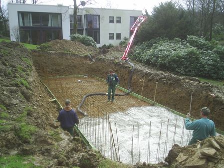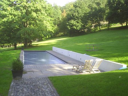 Neubau eines Gartenschwimmbades mit logistischem Aufwand: - Erdarbeiten - Betonbecken - Platten, Stufen und Pflaster aus Naturstein - Beleuchtung im Garten zur Illumination der Bäume